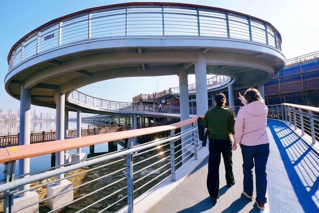 除了便捷通行,这里更是绝佳的观景平台!随着旋转楼梯缓缓攀升,脚步移动间,眼前的景致如一幅徐徐展开的卷轴:南岸公园的绿意盎然、东湖的烟波浩渺、金蛇山的苍翠静谧、金马大桥的雄伟大气、片区高楼群的现代挺拔,一一映入眼帘。“一路畅跑,一路山海”的惬意,只有亲身体验才懂~